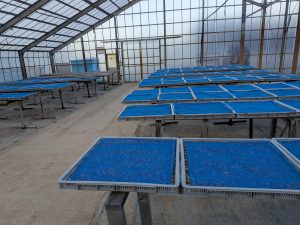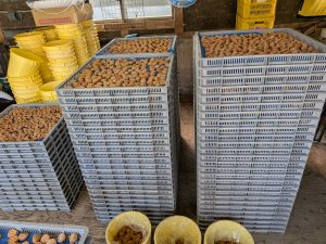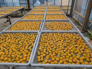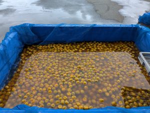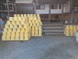 田んぼ助っ人も一段落しまして、ようやく梅の土用干しということで作業に入ります。夏場は暑すぎるので今くらいから始めて正解かもしれません。今年は約8トン分を干さないといけないので頑張ります。1桶約700キロくらい入っているので、引き上げるとセイロ140枚くらいになります。天気が良いと表2日、裏返して1日で完成します。ソレを選別して10キロ樽に入れていきます。以前神戸の父ちゃんが樽を洗ってくれたので、ソレを使います。干すと半分くらいの重さになるので、1回で35〜40樽位できるでしょうか。残り、12回分の天日干し作業頑張ります。