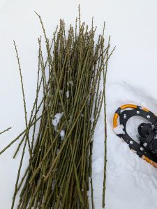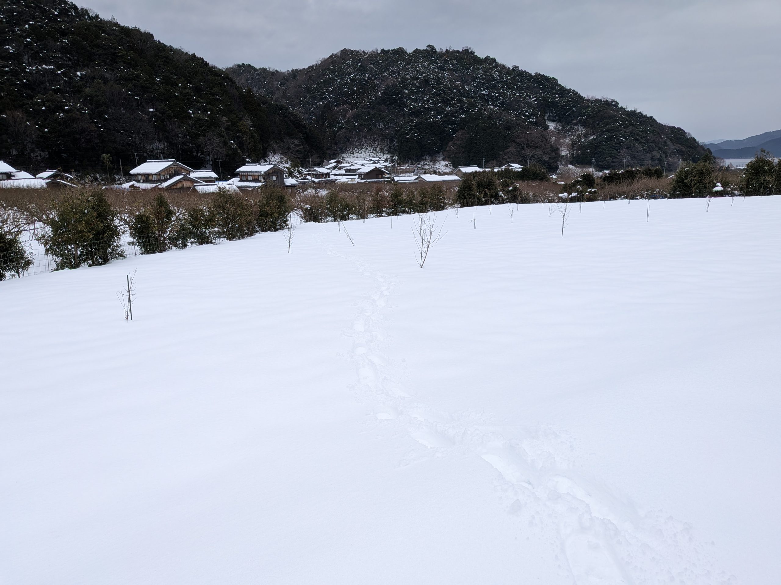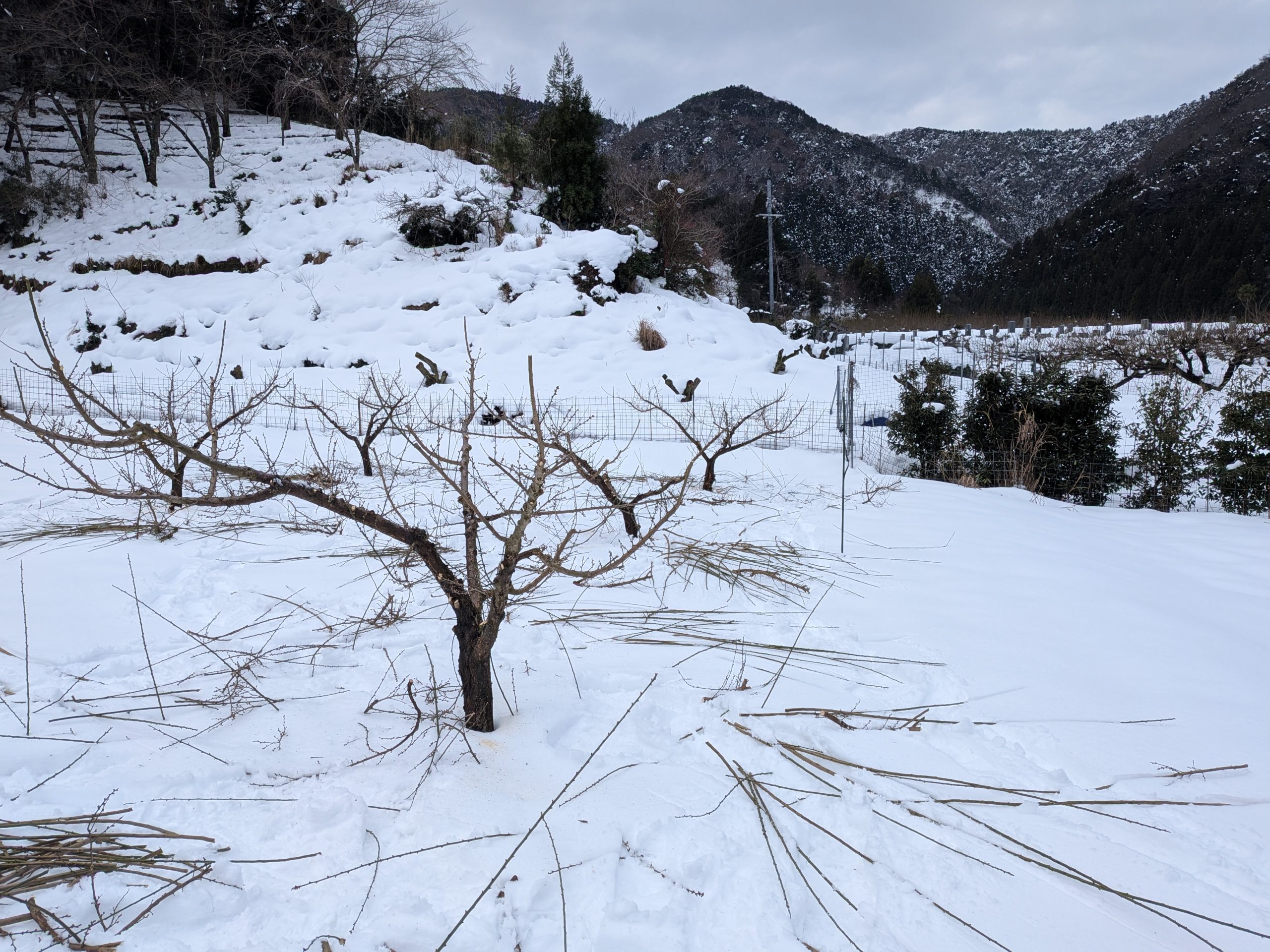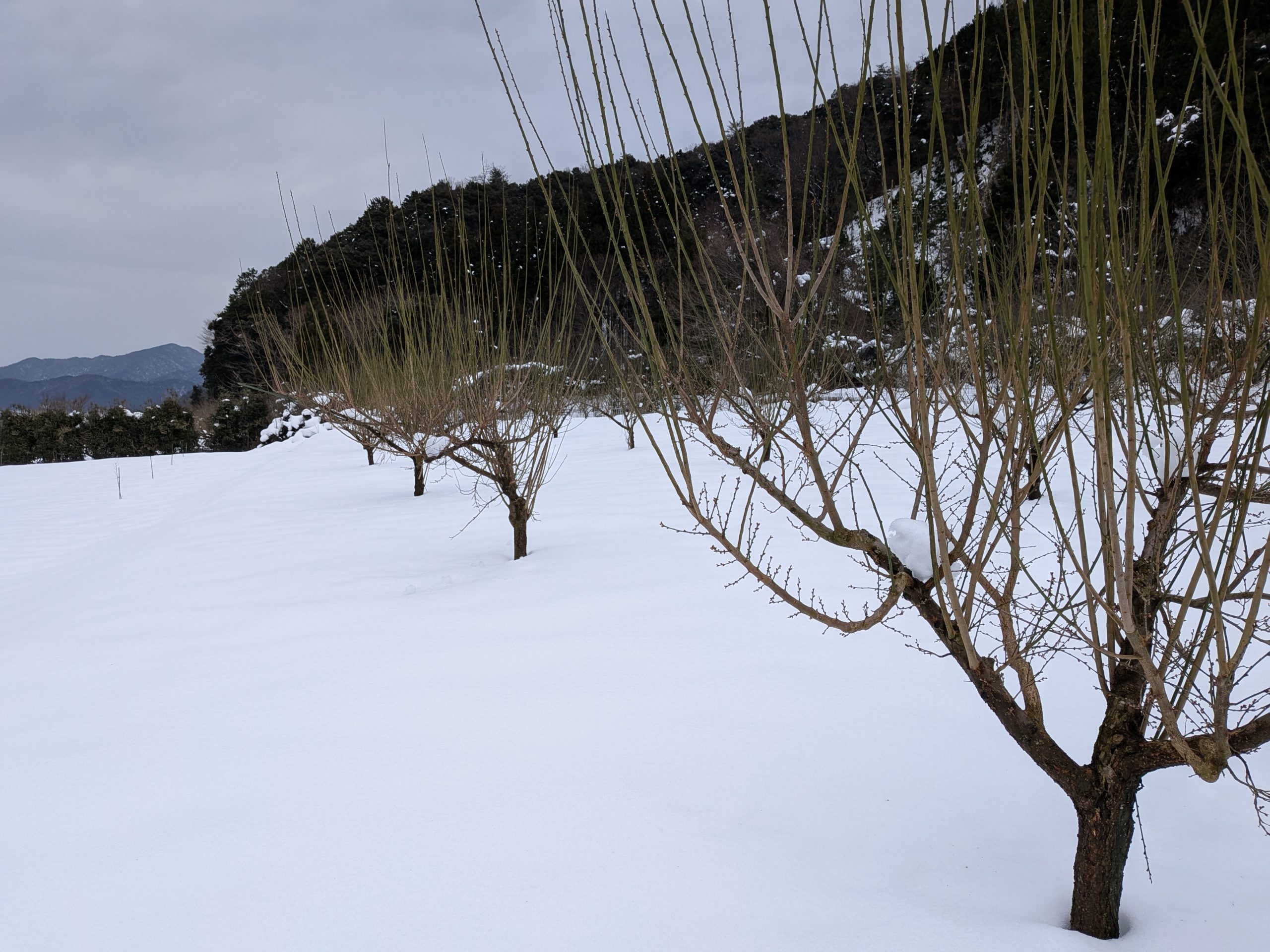 スノーシューを履きまして、現場の園地まで行ってみました。この場所は木が小さいので、脚立無しでも剪定ができます。雪道を最初は楽しく歩いていたのですが、100メートルくらい歩くと、コレが結構しんどくなってきます。かなりいい運動になります。慣れると楽になるのでしょうか。調べると雪道を歩くツアーをしている所もあるそうです。役場からウメ花枝の注文があったので、ソレも調達して、また雪道を帰って行ったのでありました。