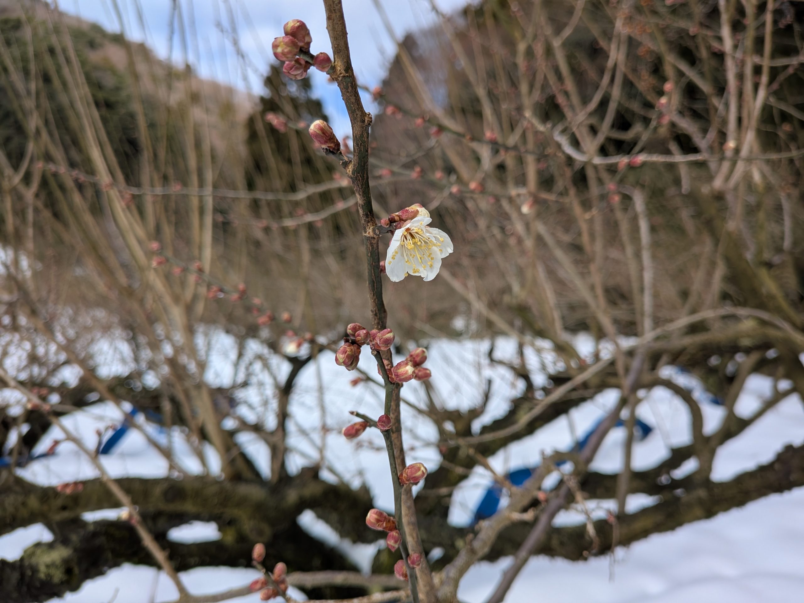 HOME > 日ノ丸福井ウメ > 日ノ丸福井ウメ 梅開花 2026年2月5日 一輪開花 梅の花 山の上から 剪定中 今日は暖かくなるようで。梅の花がチラホラと開花してきました。蕾もかなりふっくらとしてきました。枝によっては沢山咲いているものもあります。おそらく2月下旬ころ満開になるかなと思います。週末はまた寒波らしいので、もう少し咲くのを我慢してくれるといいのですが。 Twitter Share Pocket Hatena Pinterest LINE コメントする コピーする -日ノ丸福井ウメ